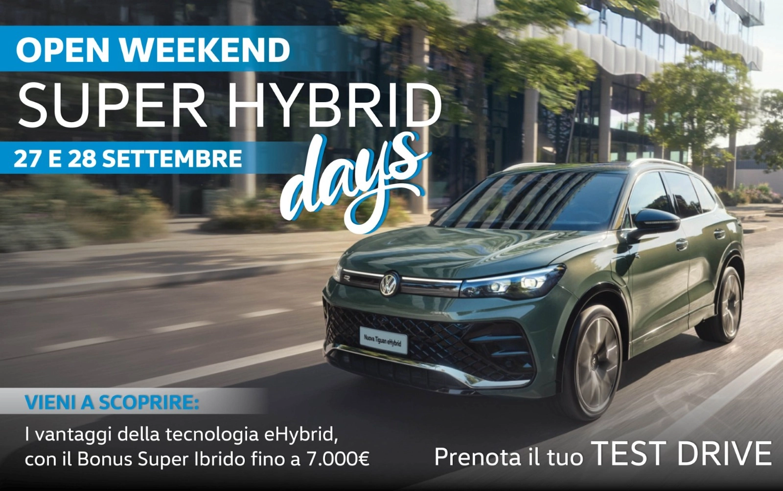 Il 27 e 28 settembre ti aspettiamo nei nostri showroom per i Super Hybrid Days Volkswagen.