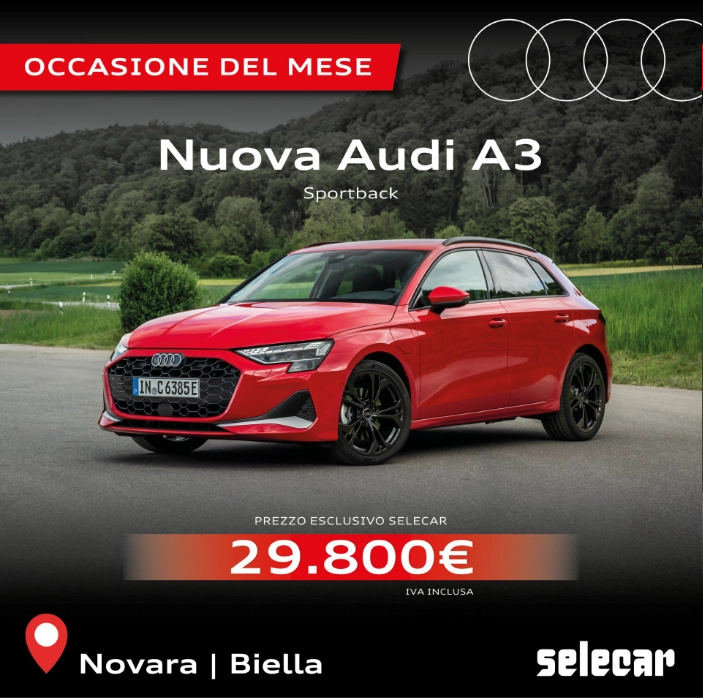 Offerta valida fino a fine mese, compatibile con la disponibilità. Il prezzo di listino è pari a €34.818,78 . Audi A3 Sportback TFSI 85 kW Stronic. Messaggio pubblicitario con finalità promozionale. Verifica condizioni e dettagli presso la concessionaria Selecar. Immagini inserite a scopo illustrativo.