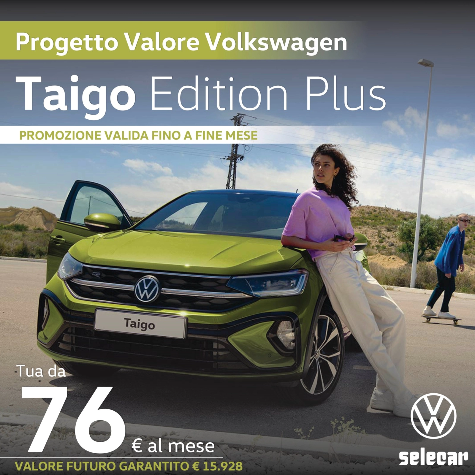 Offerta valida fino a fine mese, compatibile con la disponibilità. Taigo 1.0 TSI Edition Plus € 24.900,00 (chiavi in mano IPT esclusa) - Anticipo € 9.075,00 - Finanziamento di € 16.185,00 in 35 rate da € 75,87 Interessi € 2.399,40 - TAN 4,99 % fisso - TAEG 6,34 % - Valore Futuro Garantito pari alla Rata Finale di € 15.928,95 - Spese istruttoria pratica € 360,00 (incluse nell'importo totale del credito) - Importo totale del credito € 16.185,00 - Spese di incasso rata € 3,25 / mese - costo comunicazioni periodiche € 0 (in caso di invio cartaceo, il costo è pari ad 1€/anno) - Imposta di bollo/sostitutiva € 40,46 - Importo totale dovuto dal richiedente € 18.744,86 - Gli importi fin qui indicati sono da considerarsi IVA inclusa ove previsto - Informazioni europee di base/Fogli informativi e condizioni assicurative disponibili presso le Concessionarie VOLKSWAGEN . Salvo approvazione VOLKSWAGEN FINANCIAL SERVICES. Offerta valida sino al 31/12/2025 .
